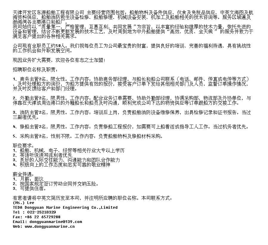 天津开发区东源船舶工程有限公司成立于1999年,主要经营范围包括:船舶修理,机械设备安装,通导设备安装修理,机加工,船舶物资及备件供应,伙食及免税品供应,中英文海图及航海资料供应,并可提供技术咨询服务。于2006年一月通过了ISO9001认证。服务区域遍及全国沿海及河道各港口、船厂。